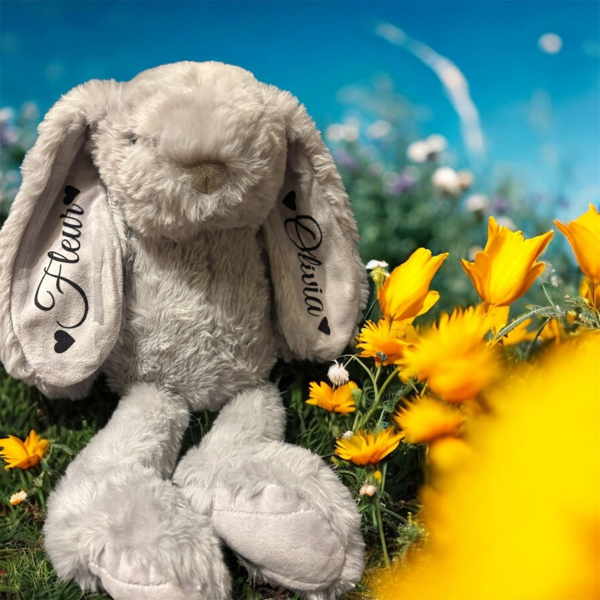 Ontdek ons schattige, superzachte knuffelkonijn met gepersonaliseerde naam in de oren.